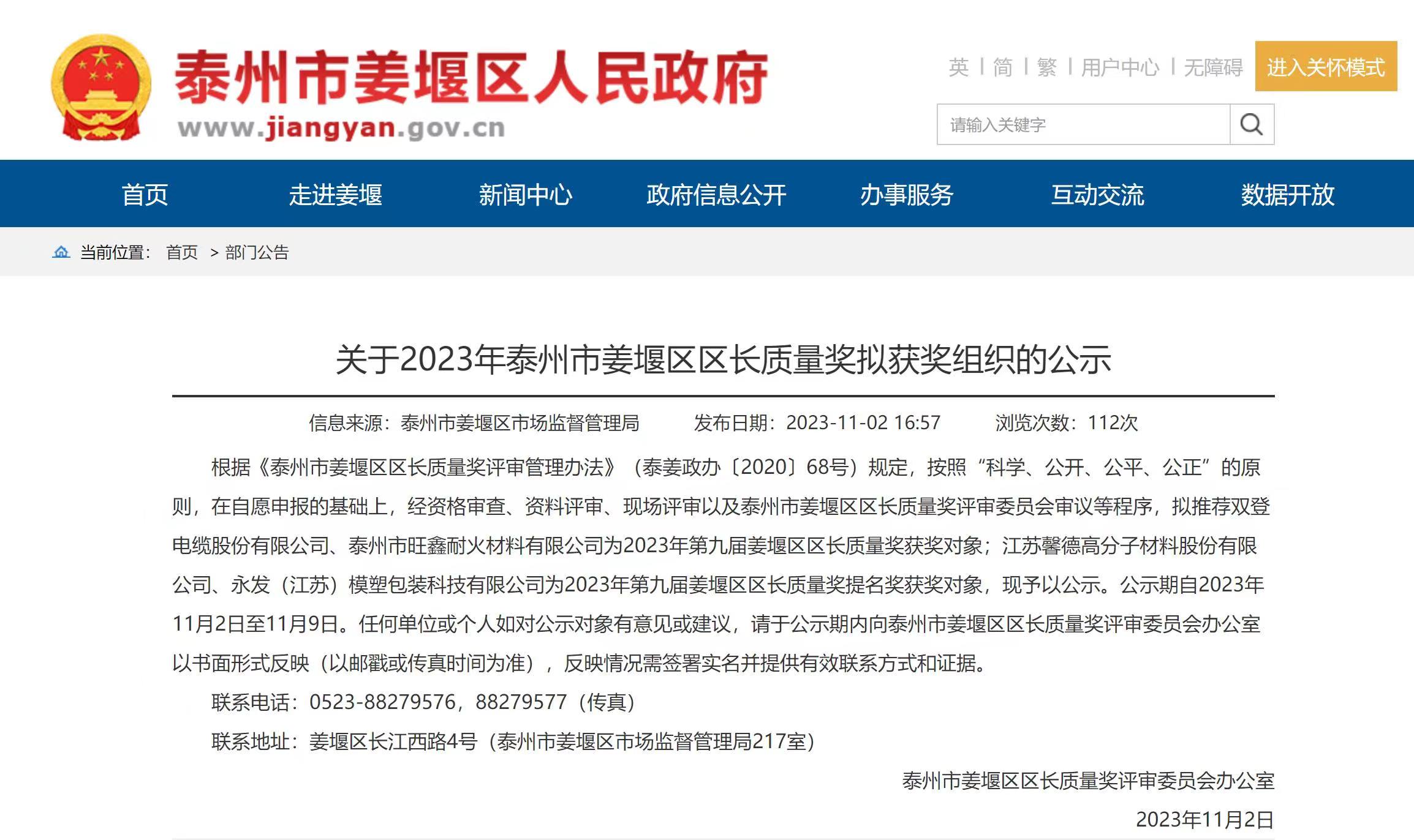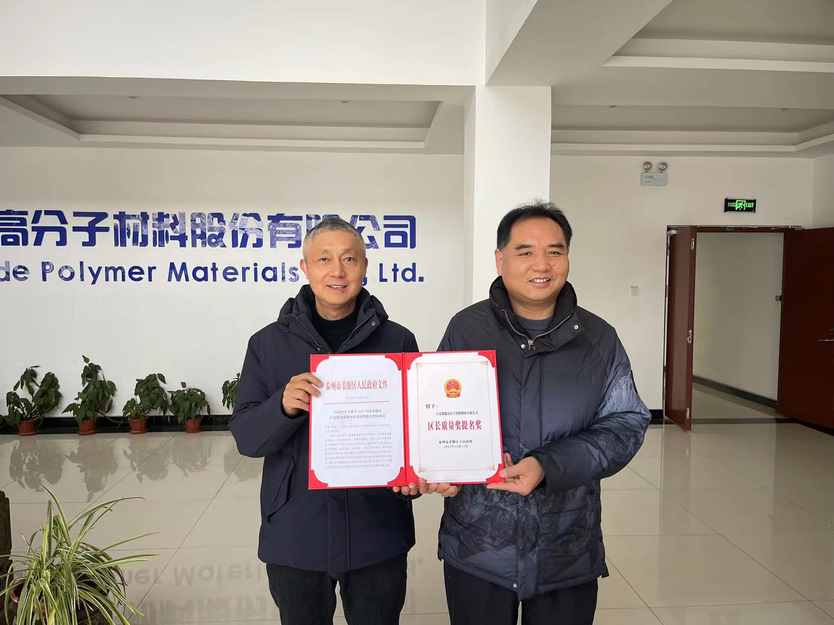 以精立業 以質取勝|江蘇馨德高分子材料有限公司榮獲姜堰區區長質量提名獎